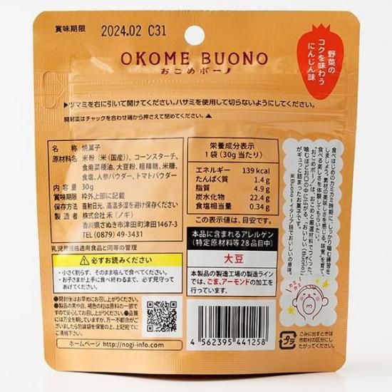Grow your sense of taste! Okome Bono [BUONO - meaning delicious in Italian]. Made without eggs, dairy products or flour and using domestic rice flour, this snack is suitable for children with food allergies. Firm and chewy texture. When broken into small pieces, they slowly dissolve with saliva. Sweet and tasty with the ingredients as they are.