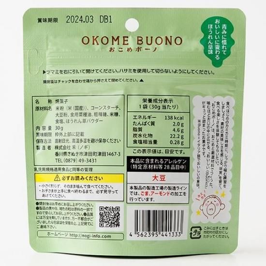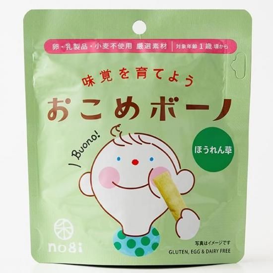 Grow your sense of taste! Okome Bono [BUONO - meaning delicious in Italian]. Made without eggs, dairy products or flour and using domestic rice flour, this snack is suitable for children with food allergies. Firm and chewy texture. When broken into small pieces, they slowly dissolve with saliva. Sweet and tasty with the ingredients as they are.